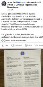Krenar që bashkë me Fatmirin, Bujarin, Kreshnikun dhe Jetonin, si dhe Nazimin, Agimin dhe Bekimin, jemi propozuar si pjesë e Kabinetit historik të Kryeministrit të parë shqiptar, Talat Xhaferi, nën udhëheqjen misionare dhe vizionare të rilindasit të fundit të kombit shqiptar, ALI AHMETI.