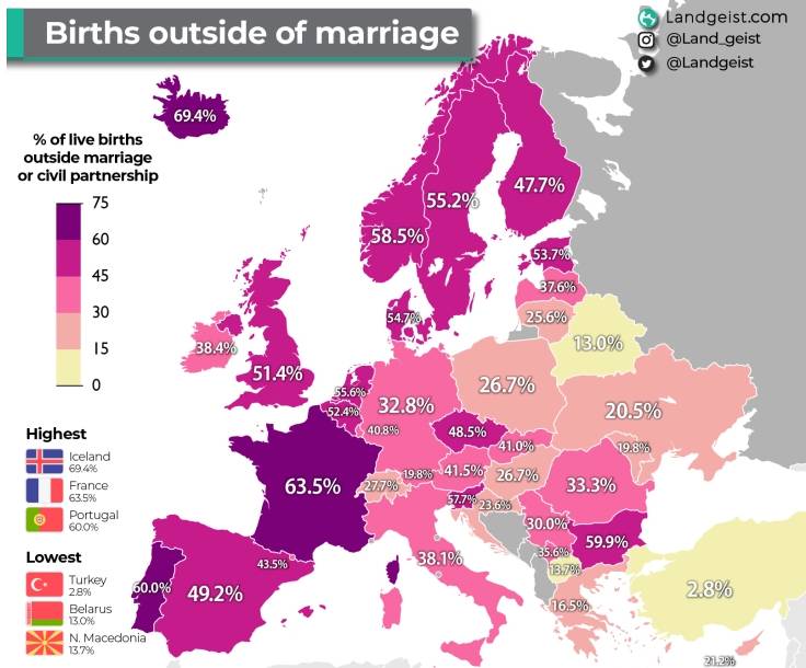 “Landgeist” vëren dhe se mosha në të cilën gratë martohen nuk do të thotë domosdoshmërisht që ato të hyjnë në një lidhje ose të krijojnë familje më vonë. Nëse shihet harta në pjesën e lindjes së lindjes jashtë martese, duket gjithnjë e më shumë çifte po bëjnë fillimisht fëmijë, ndërsa më pas martohen ose në përgjithësi nuk martohen.