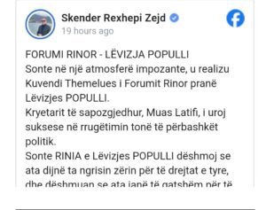 Lëvizja Populli me kryetar Skender Rexhepin ka mbajtur mbrëmë Kuvendin Themelues të Forumit Rinor, e ç’rast është zgjedhur kryetar i këtij forumi, Muas Latifi.