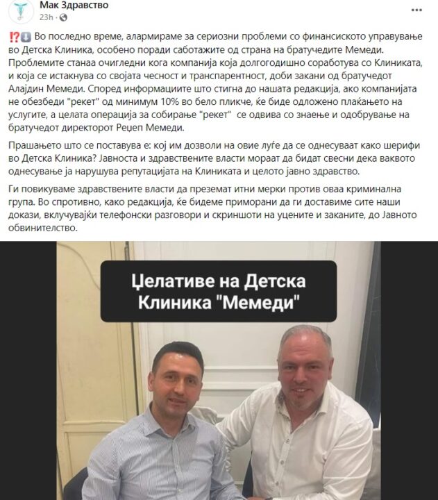 Kohët e fundit MakZdrastvo ka paralajmëruar për probleme serioze me menaxhimin financiar në Klinikën e Fëmijëve, sidomos për shkak të skandaleve që vijnë nga dy djemt e axhës Memedi.